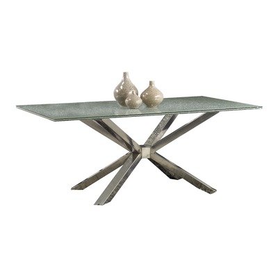 #E2470DT.STL Features: -Graphite technohyde fabric.-Contemporary design. Includes: -Set includes table and 4 chairs. Color/Finish: -Stainless steel finish with crackled glass on table.-Matte black oak finish. Collection: -Ritz collection. Warranty: -1 Year manufacturer warranty.
