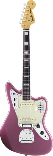 Fender 170084866 50th Anniversary Jaguar Electric Guitar, Burgundy Mist Metallic . Our 50th Anniversary Jaguar guitar takes you back to 1962, when Fender introduced an unusual new guitar that paired the sleekJazzmaster body style and elaborate control layout with a shorter scale and smaller, brighter pickups with more output. The resulting Jaguar was the fourth and last offender's original lineup of standard electricguitars.Perfectly matched to the early-'60srenaissance in design modernism, the Jaguar gradually acquired a fascinating pedigree quite unlike that of any other Fender guitar. A chromed-out, surf-rock staple of the 1960s, it found new life from the mid-1970s-on as a subversively offbeat alternative axe wielded by punk, post-punk, grunge and alt-indie guitar heroes and anti-heroes alike. The U.S.-built 50th Anniversary Jaguar celebrates that vivid history and combines old and new into the finest of all Jaguar guitars. Highly distinctive features include the classic24" scale length, a new one-degree neck-angle-pocket cut that improves pitch, are-positioned tremolo plate that increases bridge break angle and sustain, and specially designed hot Jaguar single-coil neck and bridge pickups that deliver fatter tone and more output (once again framed by the model's classic notched metal "claws"; ahum-reducing innovation only found on the Jaguar). Accessories include a deluxe brown case, strap, cable and a set of flatwoundstrings. Available in classic vintage Fender finishes Lake Placid Blue, Candy Apple Redland striking Burgundy Mist Metallic, which authentically evokes the original Jaguar's Burgundy Mist finish option.