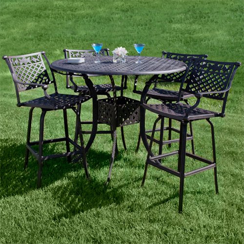 Princeton Collection Cast Aluminum Bar Set - 5 Piece - Black?Made of rustproof cast aluminum, the Princeton Collection Bar Set is the perfect addition to a smaller outdoor dining area. Have a cozy meal with a friend while enjoying the delights of the outdoors on your patio or deck. Made of cast aluminum. Set includes Cast Aluminum Bar Table and 4 Princeton Swivel Bar Chairs. Shown in Antique Bronze. Table: Dimensions: 47-3/4 diameter x 40-1/2 H (± 1/2 ). 2 umbrella cutout on table. Features basket weave pattern on table top and leg support. Swivel bar chair: Dimensions: 24-5/8 L x 22-1/4 W (front to back) x 43-1/2 H (± 1/2 ). Height to seat bottom: 28 . Seat only dimensions: 18-1/2 L x 17-1/4 W (front to back). Features basket weave pattern on seat and backrest. Simple assembly required. Easy-to-follow instructions included. 350 lb. maximum weight capacity on each chair.