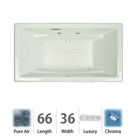 Jacuzzi ACE6636ACR4CXW White Acero 6636 Chroma Right Hand Pure Air ACE6636ACR4CX?Step in, sit back and feel the pure pleasure of being caressed by thousands of warm air bubbles exploding on every inch of your body with Pure Air . Where whirlpools circulate a combination of air and water to produce an intense, targeted massage, air baths, by design, create a softer, subtler, full-body experience. The only thing that churns the water in a Pure Air bath is just that: pure, heated air. The result is a gentle, scintillating immersion - bubbly relaxation that is more champagne than shiatsu.800W variable-speed heated-air blower Exclusive 360 Balanced Air Flow system (at high speed settings) Bottom and side air channels Wave mode TLC: Thermal Lumbar Comfort area Chromatherapy lighting system Automatic purge (drain activated) Dual armrests Exclusive Tru-Level self-leveling base system Slip-resistant bottom Safely use bath saltsCollection: Acero Drain Outlet: Right Hand Experience: Pure Air Finish: Almond, White, Black, Oyster Height: 25 Install Type: Drop-In Length: 66 Material: Acrylic Shape: Rectangle Width: 36