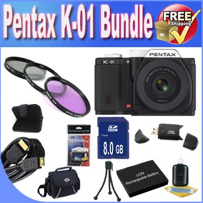 Pentax K-01 16MP APS-C CMOS Compact System Camera With 18-55mm and 55-200mm Lens (Black) + Extended Life Battery + 8GB SDHC Class 10 Memory Card + USB Card Reader + Memory Card Wallet + Deluxe Case w/Strap + Shock Proof Deluxe Case + Mini HDMI to HDMI Cable + 3 Piece Professional Filter Kit + Accessory Saver Bundle!