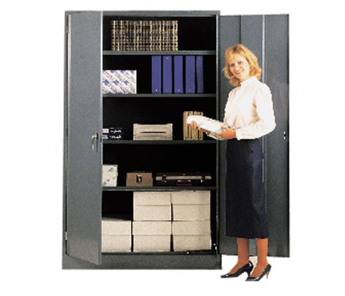 #This cavernous cabinet holds 13 cubic feet more than standard 36'' wide units more space than any cabinet available today You will save money and floor space because you will need only one cabinet. Consolidate your storage into one convenient, neat space.Copier paper, books, binders, cleaning supplies and more are kept neatly out of sight. Heavy duty welded 16 gauge steel door frames and all steel construction make this unit strong enough for the warehouse, yet it is attractive enough for the office. Four shelves adjust on 2'' centers and hold up to 400 lbs. each, evenly distributed.Three point locking mechanism secures steel reinforced doors to keep contents safe. The brushed chrome ''L'' shape handle contains a built in key lock two keys are included. Two front leveling glides compensate for uneven floors. Ships ready to assemble.
