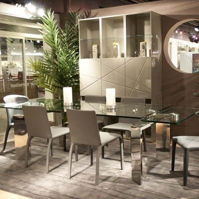 #E2402XT-2DGHG Features: -Contemporary design. Includes: -Set includes table and 6 chairs.-Table includes self storing leaves.-Buffet includes grey curved glass sliding door and stainless steel accents. Color/Finish: -Dark grey high gloss leg finish with 19mm Clear glass top.-Chair finish: Graphite.-Buffet: Dark grey high gloss finish and grey glass top. Dimensions: -Overall Table Dimensions: 30.5'' H x 78 - 110'' W x 39'' D.-Overall Chair Dimensions: 33'' H x 22'' W x 19'' D. Collection: -Ritz collection. Warranty: -1 Year manufacturer warranty.